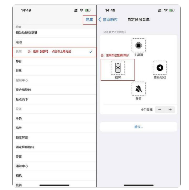 3、找到“截屏”以后勾选然后点击右上角完成,完成以后“截屏”的按钮就出现在了“触控”当中。
