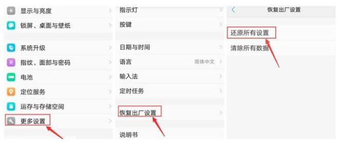 如果方法一不能解决的话,可能是系统出现漏洞故障导致,需要恢复出厂设置解决。首先进入手机设置-更多设置-恢复出厂设置,点击还原所有设置,等待系统还原完成即可退出安全模式。不过在恢复出厂设置时候,需要先将手机上面的信息做好备份,以防止重要信息丢失。