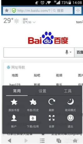 1、首先打开手机上的UC浏览器,点击中间的菜单栏进入菜单选项。