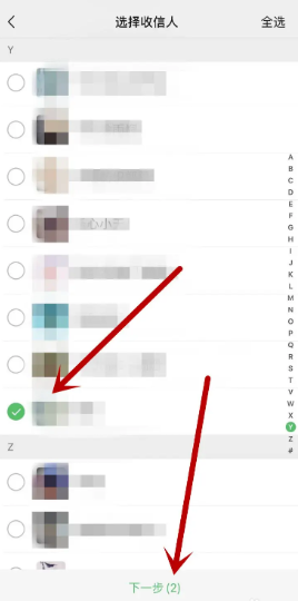 4、勾选要群发信息的朋友,也可以点击右上角“全选”,再点击【下一步】。