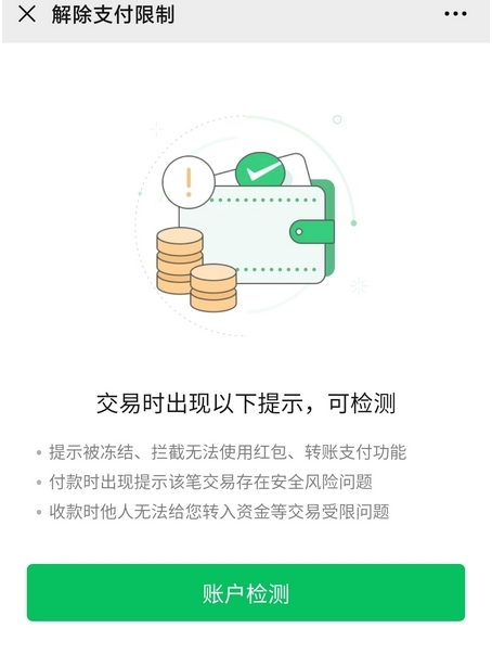 7、点击“账户检测”,我们根据提示进行操作解除限制就可以啦。