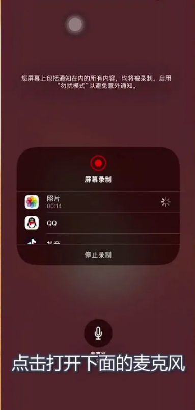 3、进入屏幕录制页面之后,点击打开下面的麦克风,打开以后苹果手机通话即可录音。