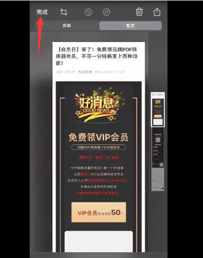 3、拖动右侧的滚动条,就可以将全部的内容截取下来,再点击左上角的【完成】,保存为PDF格式即可。