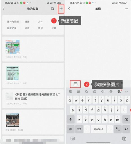 1、登录个人微信,点击“收藏”进入。在“我的收藏”右上角,点击”+“新建笔记,并将多张截图全部添加进去笔记中。