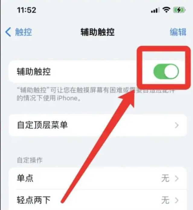 2、点开辅助触控设置页,将“辅助触控”设置为“开”。