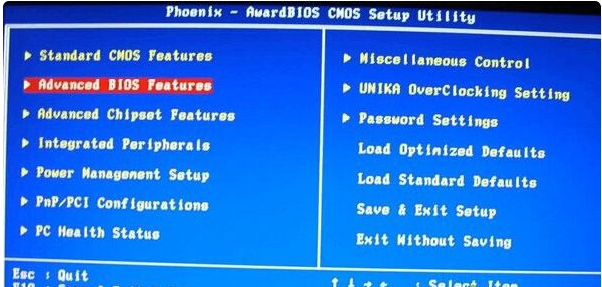 1.启动电脑的时候按键盘的del键进入bios设置界面,通过键盘的上下键选择Advanced BIOS Features并回车,进入下一步。