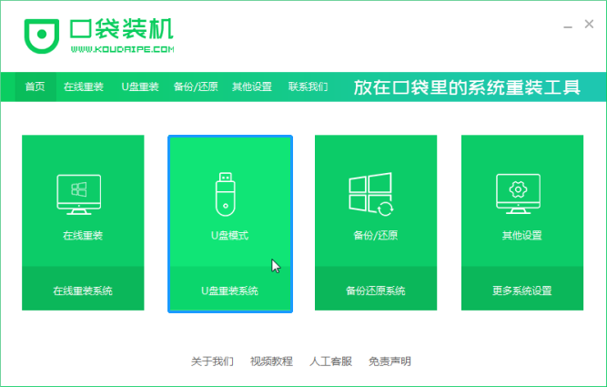 1、首先我们需要先打开口袋装机软件,之后选择U盘重装系统。