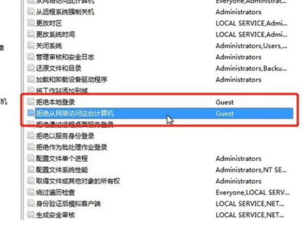 3、然后在弹出来的界面依次选择,计算机配置、Windows 设置、安全设置、本地策略-、用户权限分配,需要找到【拒绝本地登录】和【拒绝从网络访问这台计算机】的选项,双击进去把Guest删除。