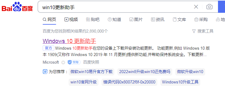1、百度搜索“win10更新助手”,选择微软官方页面进入。