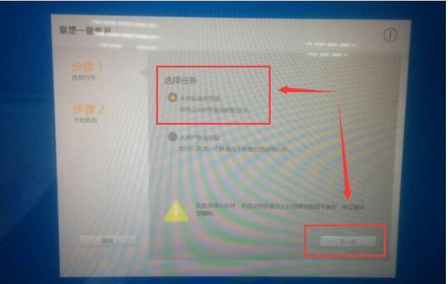 2、我们选择任务,选择“从初始备份恢复”,点击“下一步”按钮继续。