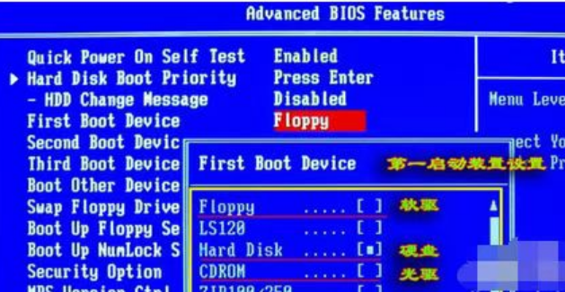 2、在未开机前狂按del键,进入之后,将第一启动方式改为光盘启动。