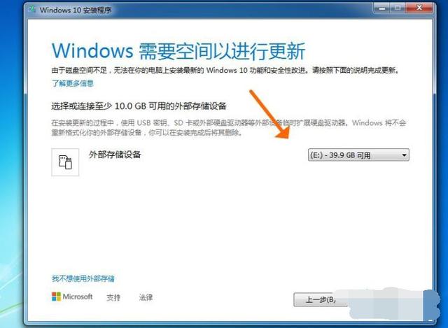 7、Win7升级Win10至少需要10GB的外部存储空间,在外部存储设备中选择保存的位置,这里选择一个除了C盘以外的分区比如E盘。