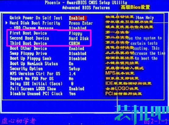 在这个界面中,有First Boot Device 、 Second Boot Device 、 Third Boot Device三项,这三项就是设置启动设备的启动顺序的。将光标移到First Boot Device上。按回车键,出现可供选择的启动设备界面:
