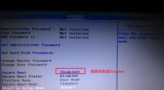 注:如果Security选项下没有Secure Boot选项,那就看一下有没有Clear Intel PTT Key选项,如果有就回车选择yes清除PTT Key,要不然安装系统后会导致无法引导启动;