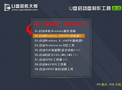 1、将制作好的U盘装机大师U盘连接电脑,重启电脑,画面出现开机logo时按下启动快捷键,选择u盘所在的选项,按回车键进入U盘装机大师主菜单。进入U盘装机大师主菜单,选择【02】启动Windows-2003PE(老机器),按回车键进入。