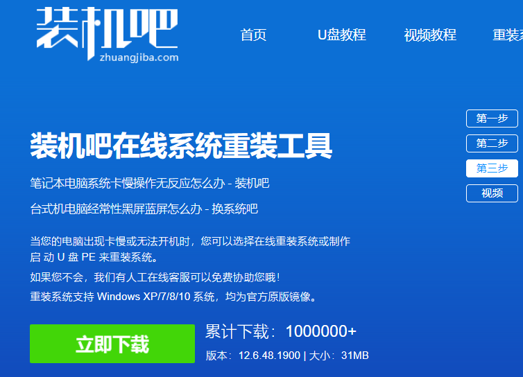 1、进入装机吧官网首页,下载装机吧一键重装系统软件,然后将U盘插入电脑,打开装机吧软件。