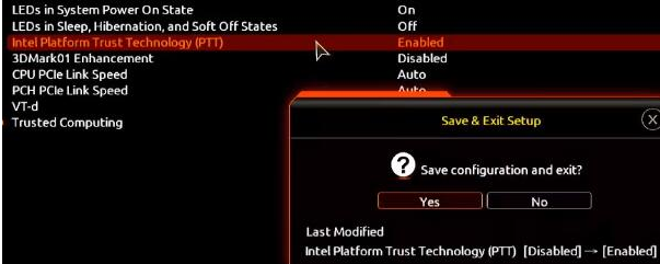 4、最后只需要将安全设备支持设置为允许,TPM设备选择为PTT即可。