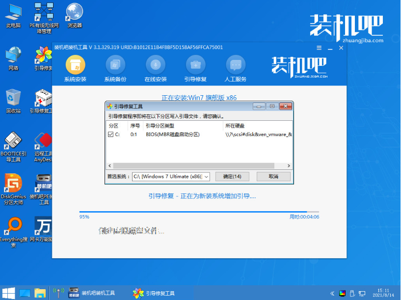 5、进入pe系统后,开启装机吧装机工具并安装win7系统。