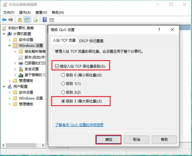 4、入站TCP流量界面下,勾选指定入站TCP吞吐量级别,选择最大吞吐量3。设置好后,点击“确定” 按钮。