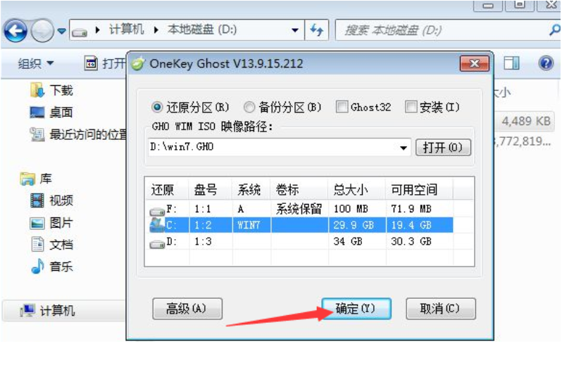 3.接着我们打开一键还原ghost工具,选择“还原分区”,映像路径选择win7.gho文件,选择系统要安装的位置,一般是C盘,或者根据磁盘容量选择安装位置,点击确定。