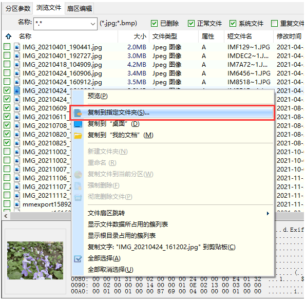5、勾选需要恢复的文件,点击鼠标右键并选择"复制到指定文件夹"。然后就可以在其他分区设置文件夹来保存恢复好的文件了。