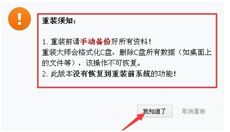 步骤四:在计算机检测完成后,屏幕会弹出一些注意事项,看完后我们用鼠标点击知道了。