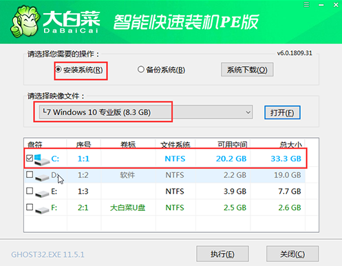 3、然后双击打开装机软件,选择win10映像文件,勾选“C盘”,点击执行。