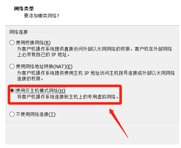 8.进入到选择网络类型的窗口中,选择“使用仅主机模式网络。