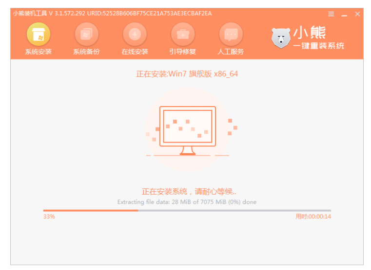 5、进入pe系统后,小熊会自动弹出安装win7系统界面,耐心等待即可。
