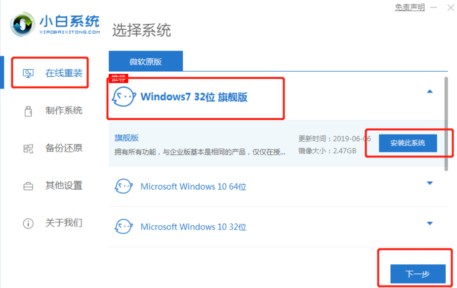 2.点击“在线重装”选择系统版本,点击“安装此系统”,再点击“下一步”;
