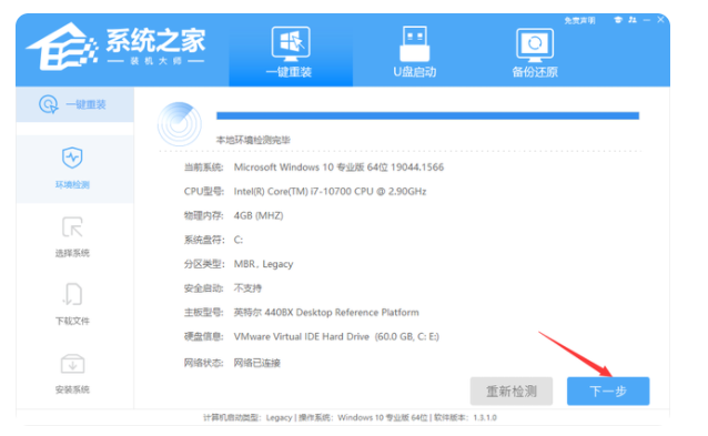 2、等待自动检测当前电脑系统的相关信息,点击下一步。