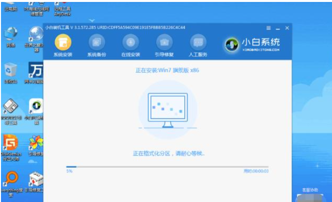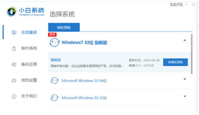 1、下载安装小白一键重装系统工具然后打开,选择在线重装选项下的win7旗舰版系统进行安装即可。