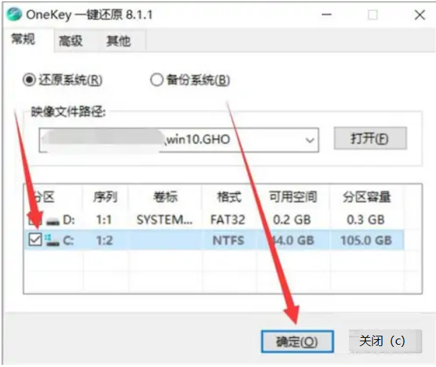 4、在“OneKey一键还原”软件面板的“常规”版面中,选中分区【C】,单击【确定】就会自动重装系统。