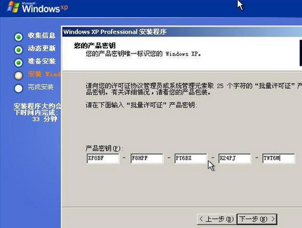 步骤5、输入产品密钥,XP安装跟Windows 7安装有所不同,不输入密钥就别想进入下一步操作,输入完成后点击【下一步】。