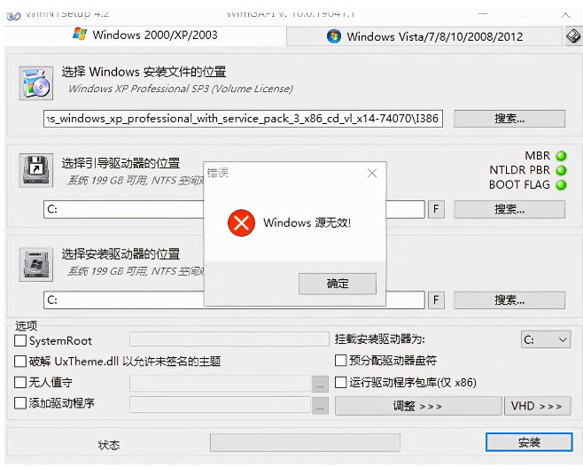2、下载完成后,将xp镜像文件复制到U盘中。安装前先确认一下磁盘的模式要使用MBR。然后通过PE盘进入需要安装的系统电脑。找到WinNT setup程序,打开后通过此软件加载镜像文件安装系统。(如果将xp镜像直接解压,选择I386文件安装,显示Windows源无效。如果直接选择xp的iso,无法找到iso文件。)见下图: