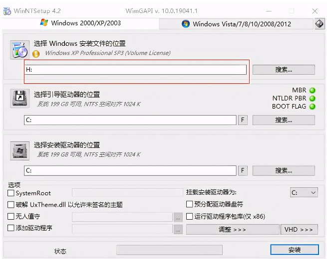7、选择Windows安装的位置选择加载xp iso文件的虚拟驱盘,引导驱动器的位置选择C盘,安装驱动器的位置同样选择C盘。点击安装。