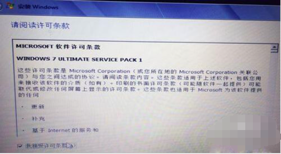 4、接下来就会进入u盘重装系统的阶段,我们根据安装向导指示进入条款接受界面。