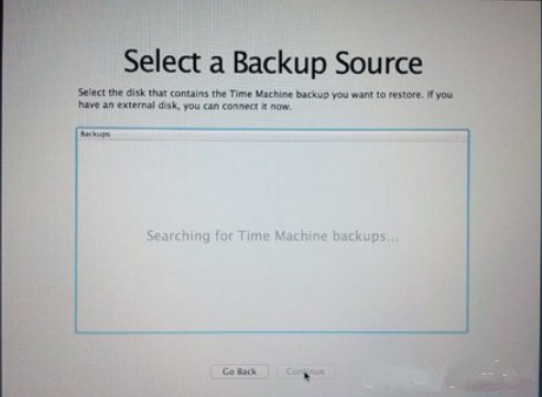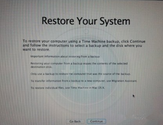 5.如果点击 Restore From Time Machine Backup,记着此时要将过去用作 Time Machine 备份的外置硬盘与 MacBook Air连接后 ,再点按Continue。
