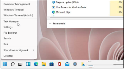 1、鼠标右键单击 Windows 11 上的“开始”菜单。从菜单中点击“任务管理器”,它将打开。